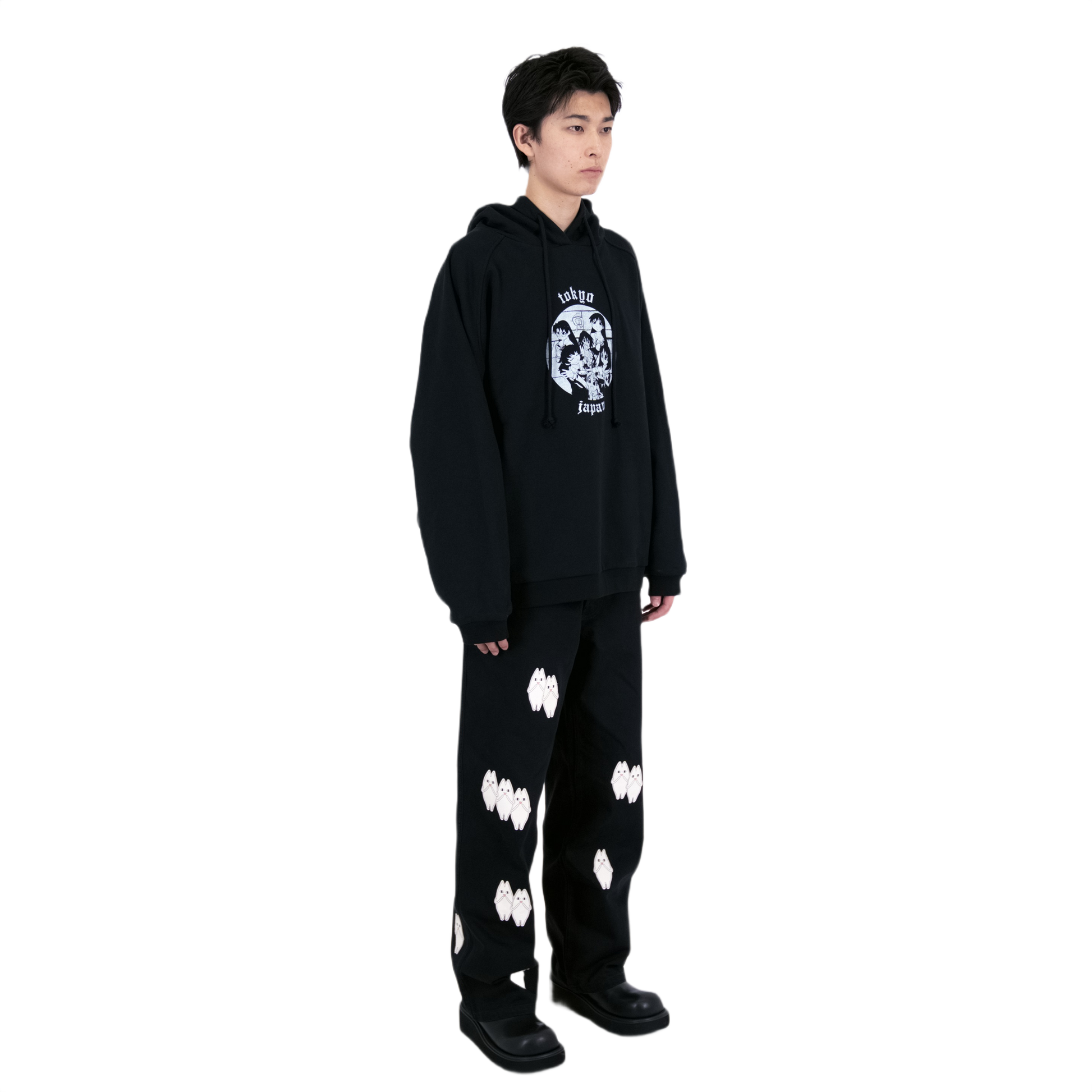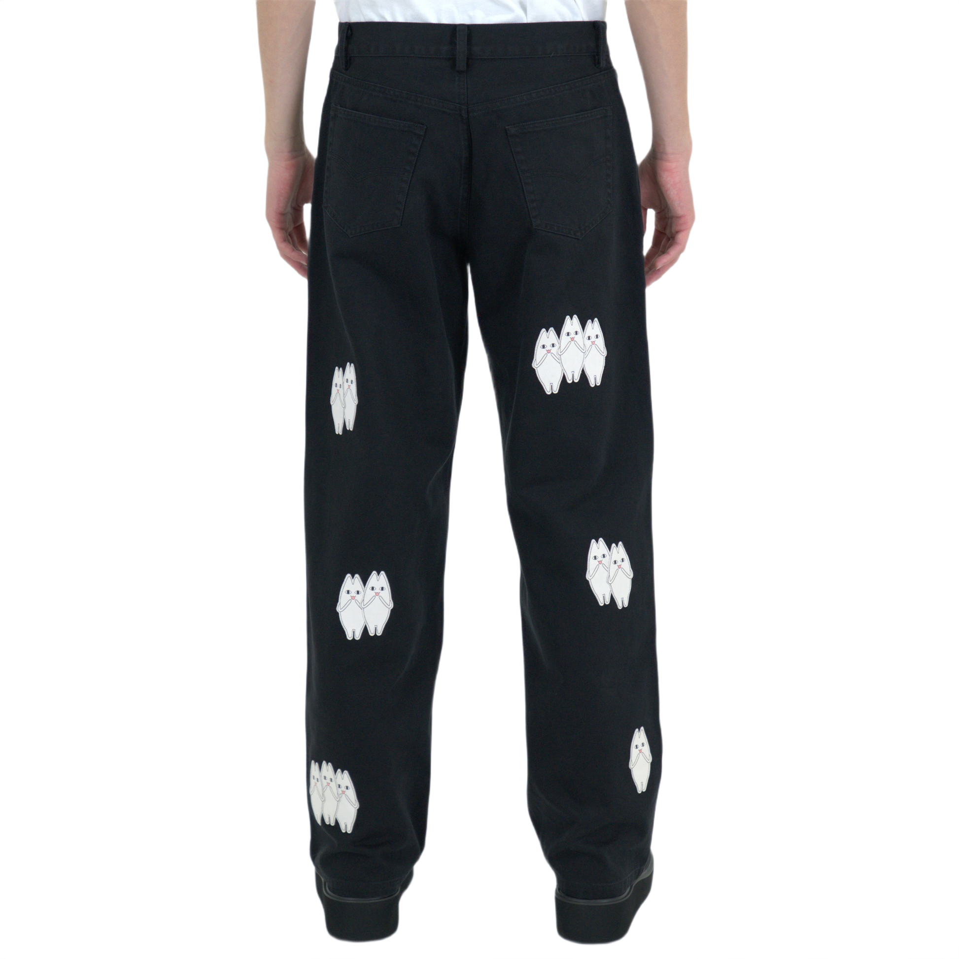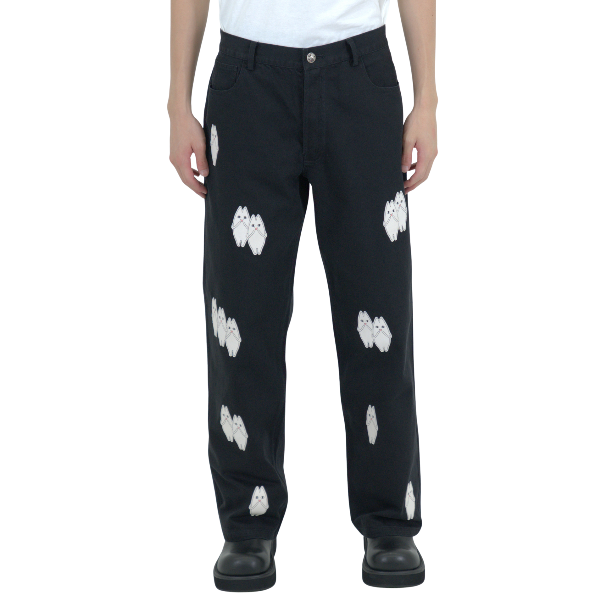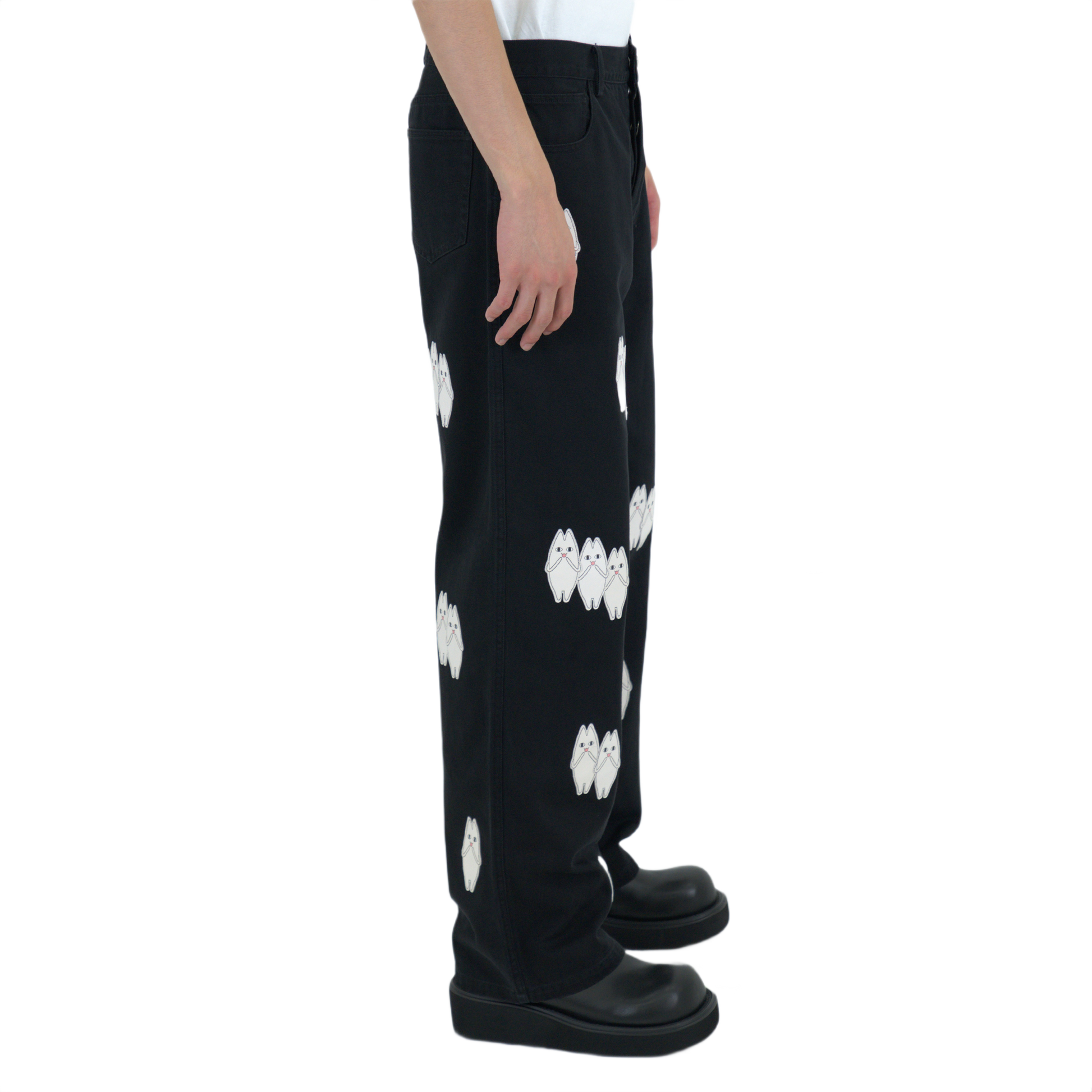 100% cotton Denim Jeans featuring .925 Sterling Silver plated button fly and rivets throughout. Modeled after the 501 cut but with a slightly wider leg. This unique pair features 28 White lambskin leather patched with printed Chiyo-Father detail.