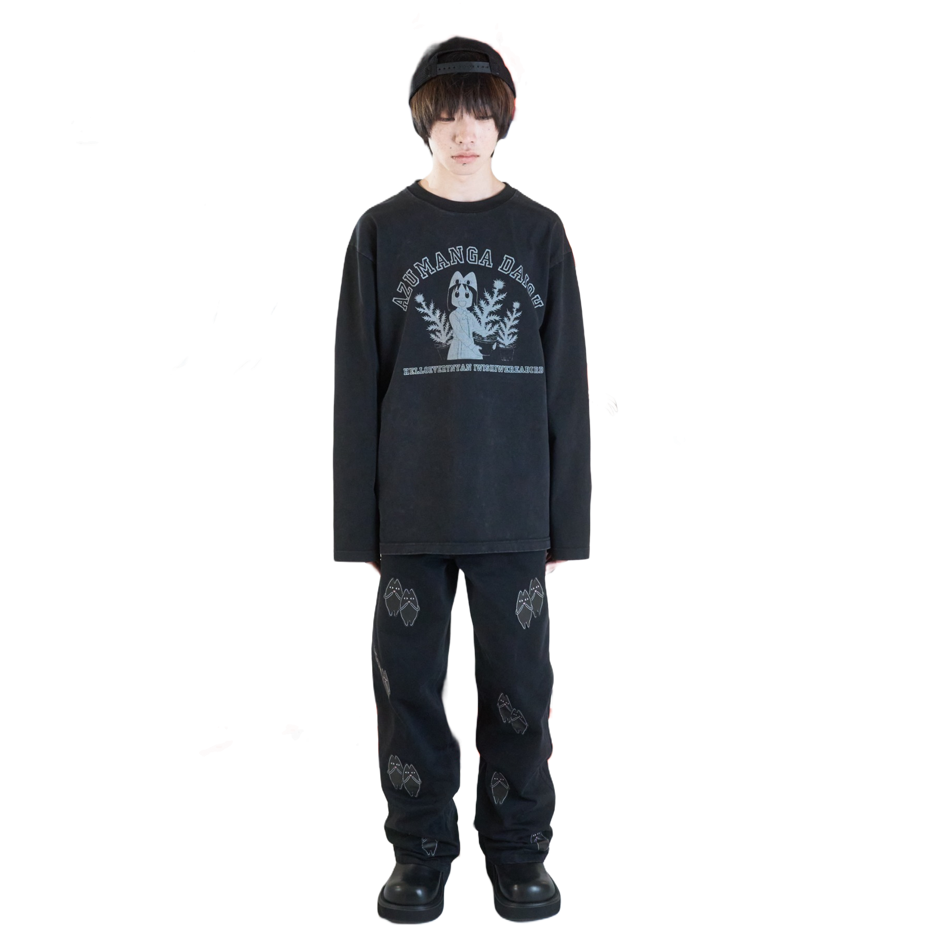 100% cotton Denim Jeans featuring .925 Sterling Silver plated button fly and rivets throughout. Modeled after the 501 cut but with a slightly wider leg. This unique pair features 28 black lambskin leather patched with printed Chiyo-Father detail.