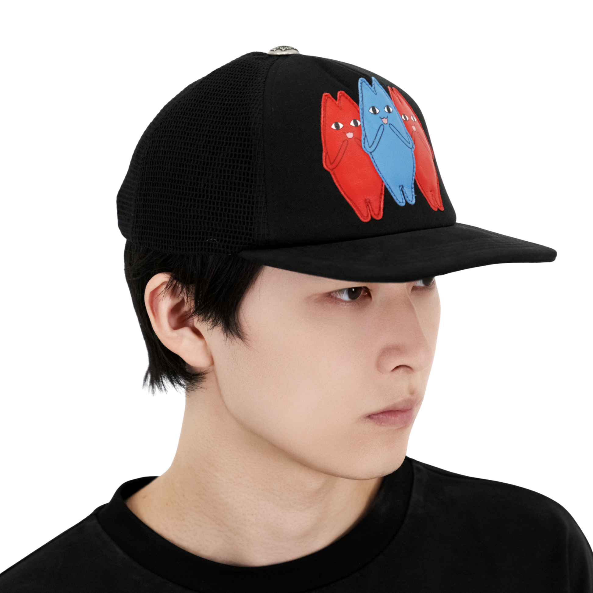 Trucker cap featuring 3 luxury calfskin leather patches, sterling silver hardware and 100% cotton mesh and front panel. Snapback adjustable size.