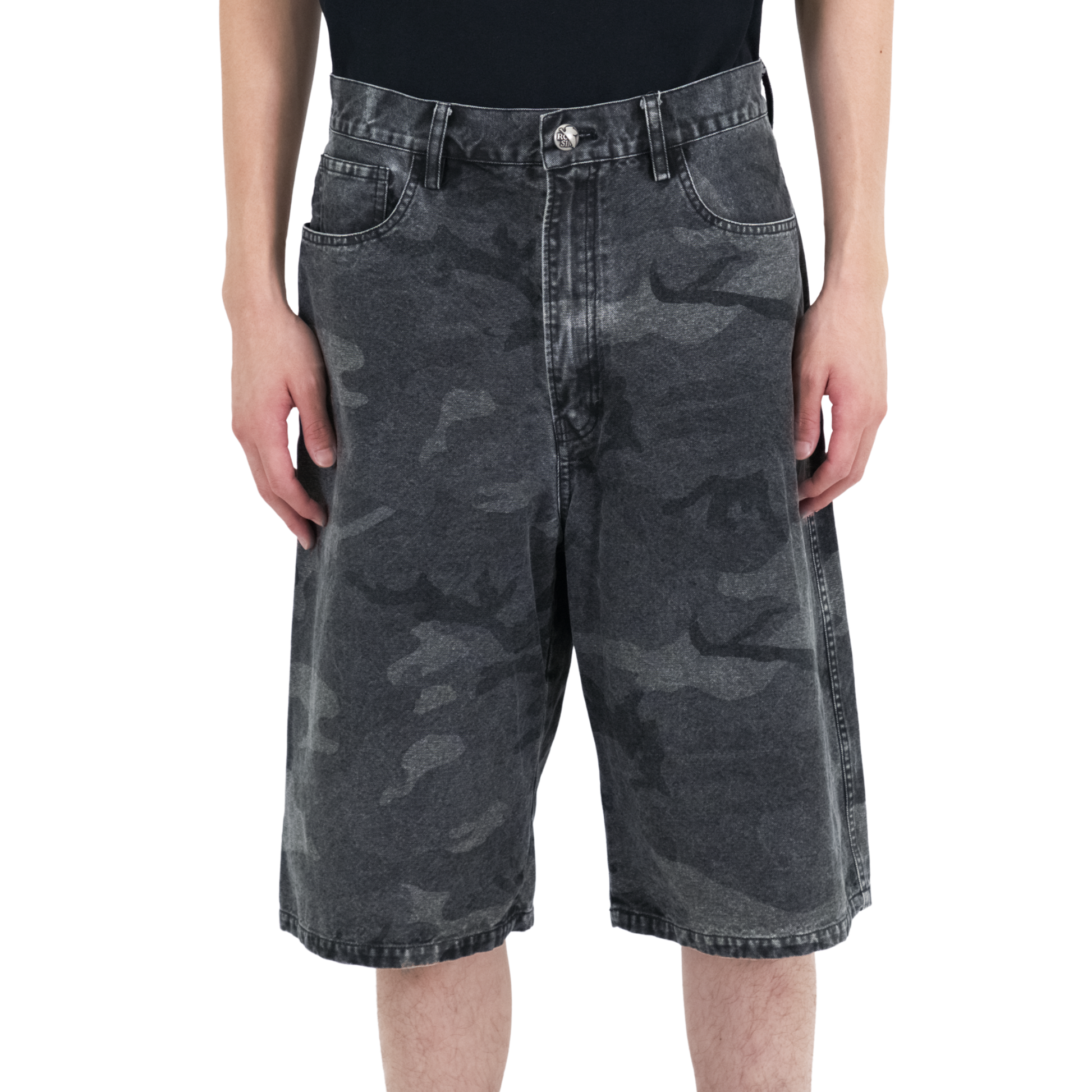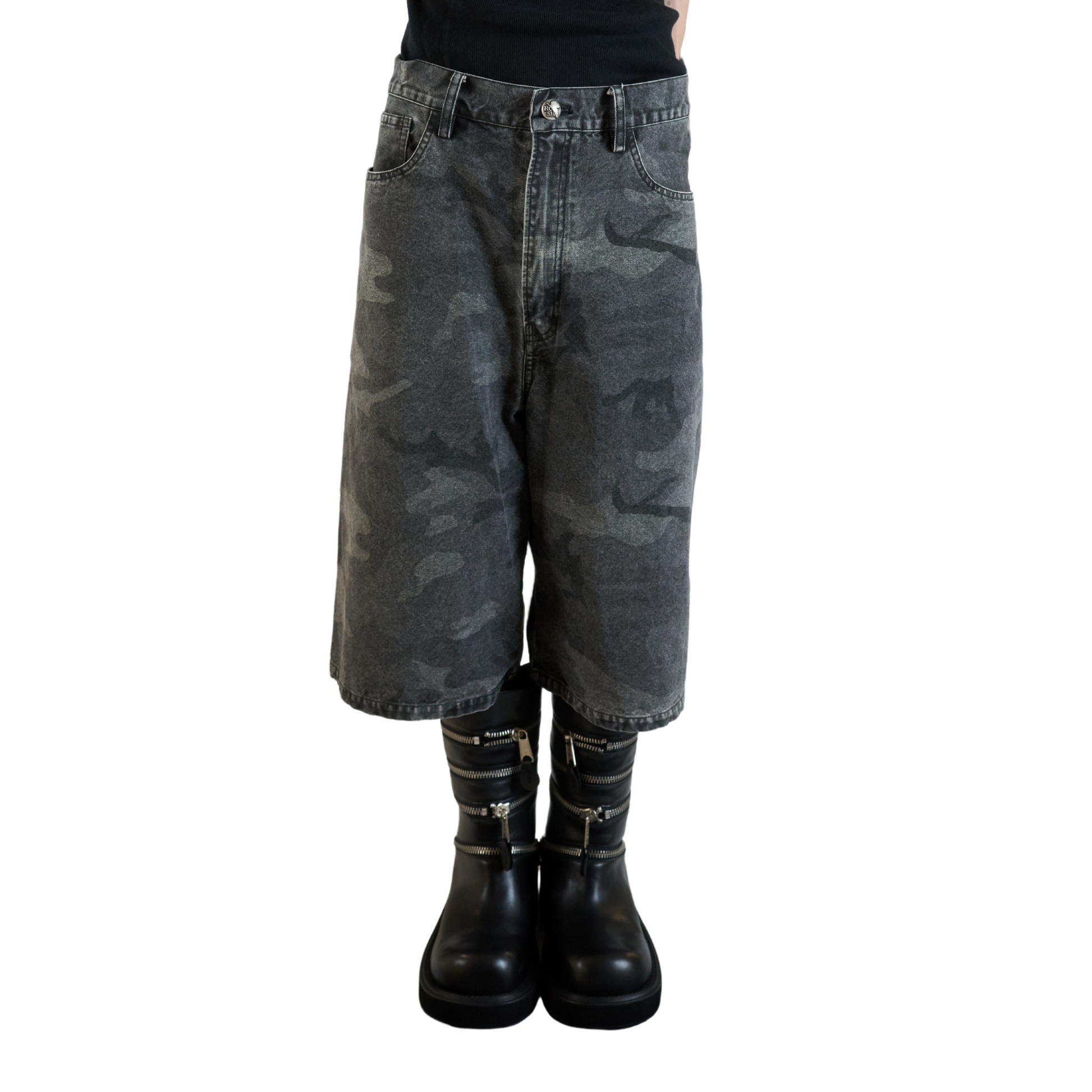 Oversized Camo Jorts 100% cotton and heavily vintage treated. Soft hand feel and wide leg opening cut for relaxed wear. Features a .925 sterling silver plated front button, zip closure.
