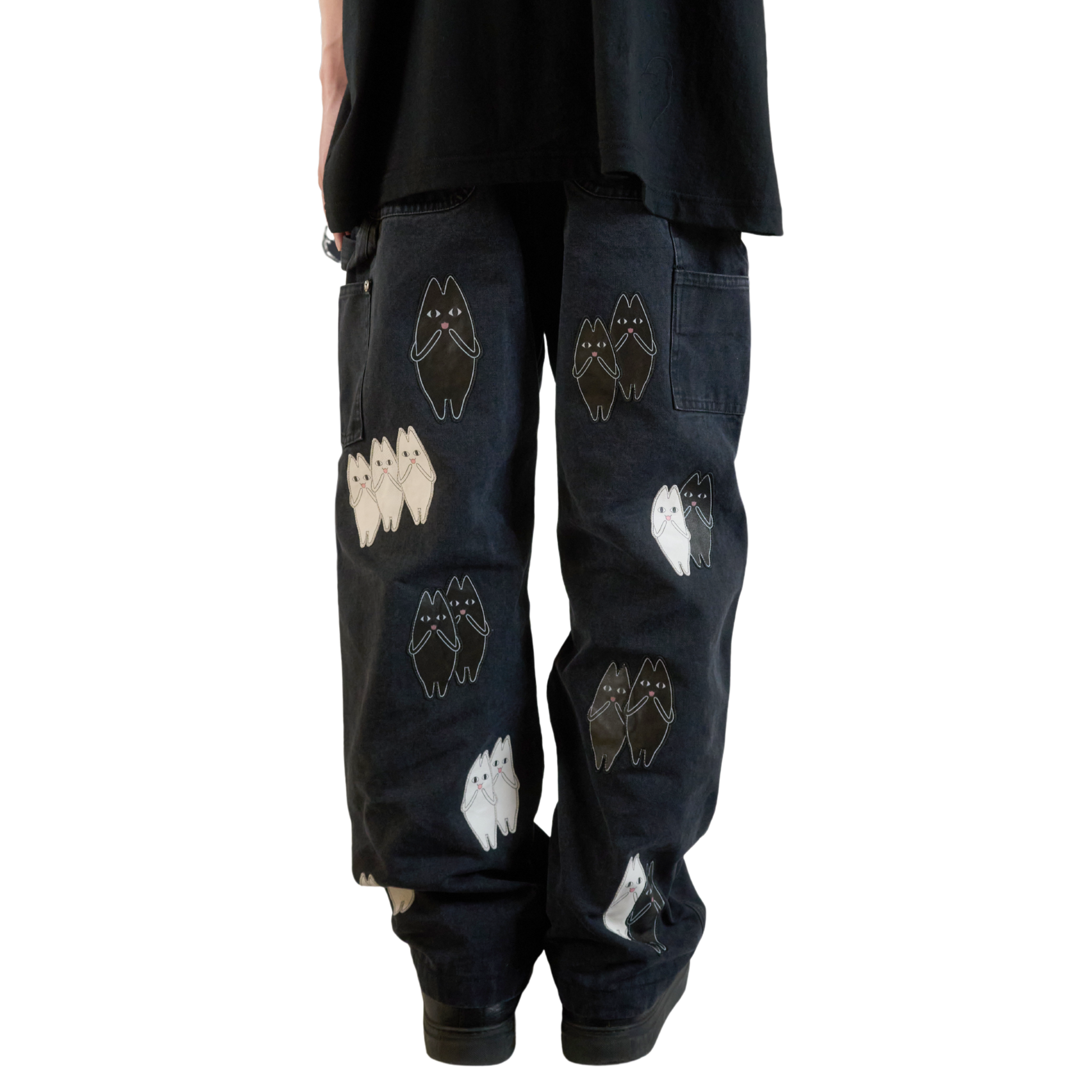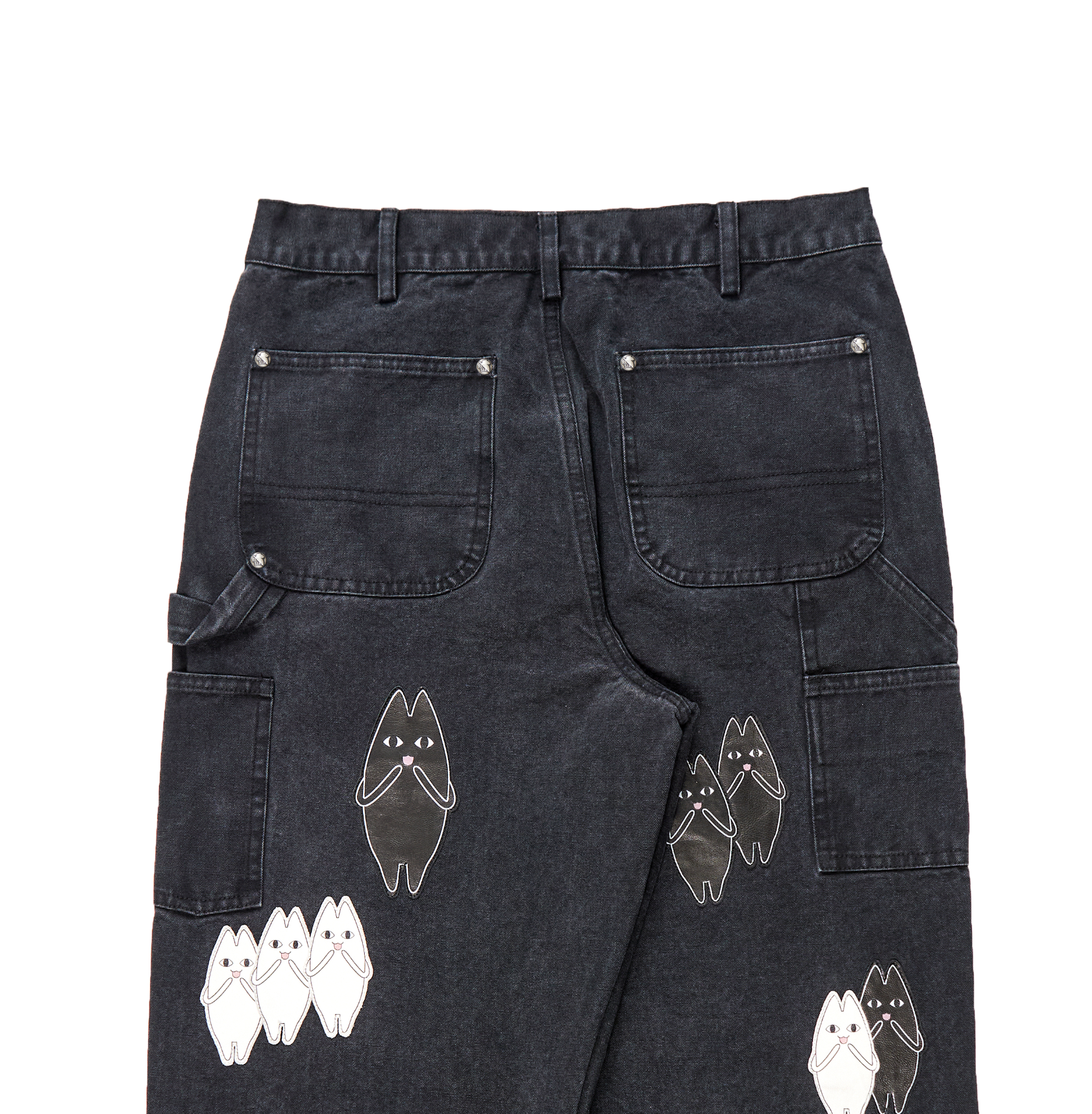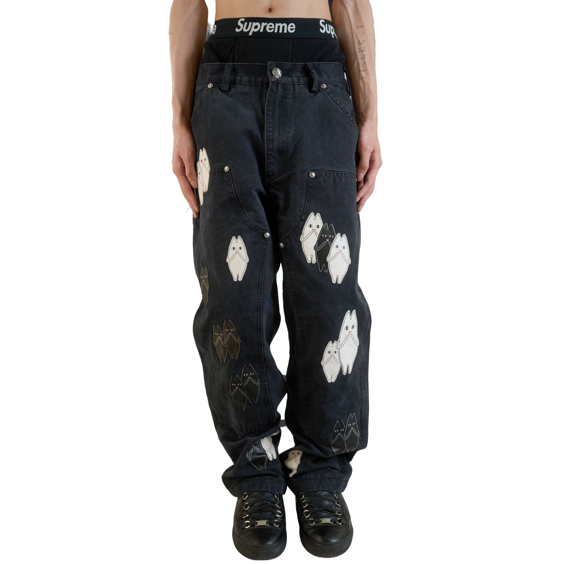Featuring black and white leather patches, .925 Silver hardware rivets and button details. Heavy 100% cotton canvas carpenter pants with vintage finishing and medium distressing.
